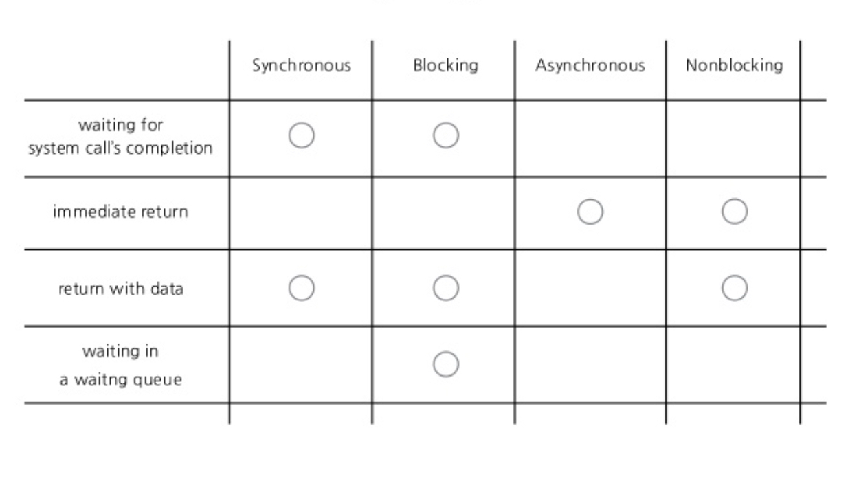 - 시스템콜의 리턴을 기다리는동안 대기 큐에 머무는 것이 필수(blocking)냐 필수가 아니냐
