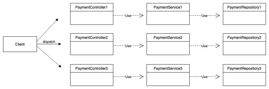 가장 쉽게 생각할 수 있는 방법은 결제방식 마다 각각의 컨트롤러, 서비스, 레포지토리 를 두는 구조이다.