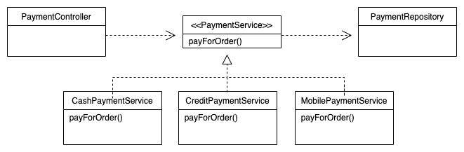 다음과 같은 형태로 Controller 는 오직 인터페이스만 의존한다. 인터페이스에서는 payForOrder() 라는 결제기능만 정의하고, 구현방법은 구현클래스들이 알아서 결정할 일이다. 코드에 변경이 필요할 때에는 해당 결제방법의 payForOrder() 메서드만 수정하면되고, 다른 결제 방법이 추가될 때에도 PaymentService 인터페이스를 implements 하고 payForOrder() 만 구현하면 다른 클래스는 수정하지 않아도된다.