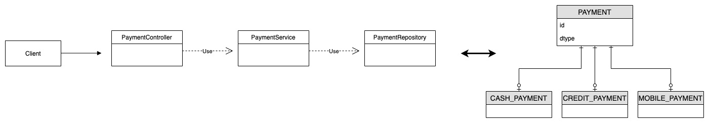 얼핏 봤을 때 굉장히 단순한 구조로 로직의 변경에도, 결제방식이 추가되더라도 책임이 있는 해당 클래스만 변경하면 되므로 해결한듯(?) 하다. 하지만 결제수단이 n개로 확장됨에따라 n개의 테이블을 만든다면, JPA외의 툴을 사용할 때 상당히 복잡할 것이다.